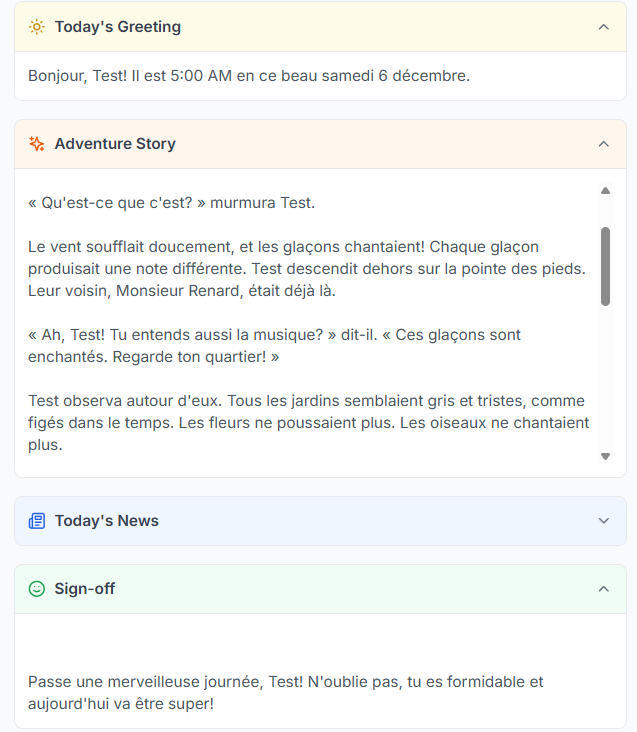 When you select French or Spanish, the entire morning adventure is generated natively in that language. This isn't translation - we're not taking an English story and converting it. The AI generates the story from scratch in French or Spanish, using natural phrasing that sounds like a native speaker telling your child a story.