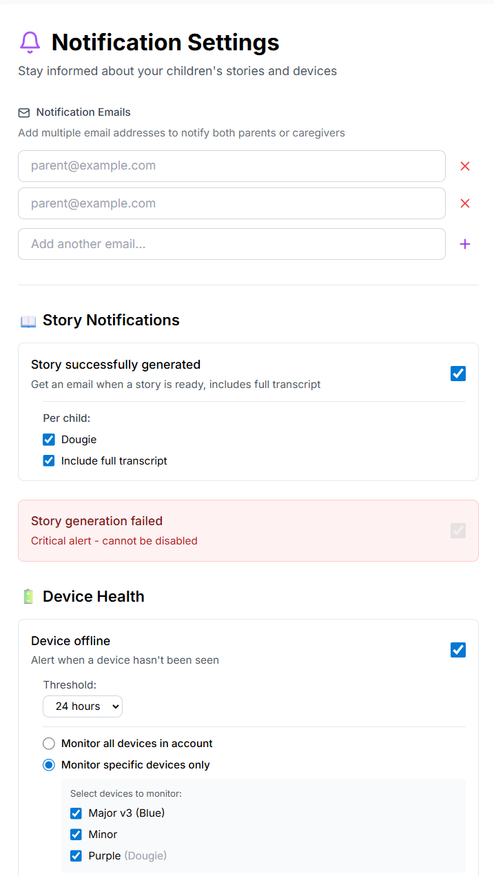 Both parents can receive notifications. Add multiple email addresses and decide who gets what. Mum gets the story summary, Dad gets the device alerts, or everyone gets everything. However you want to split it.