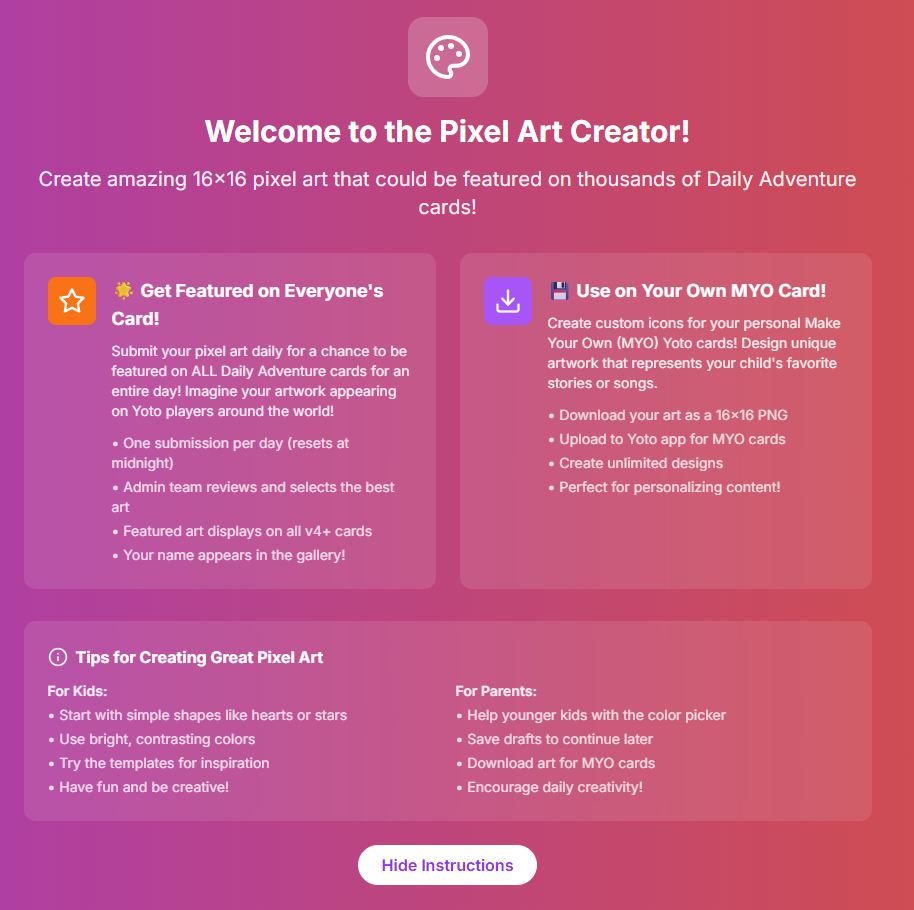 The Icon Maker lets kids create 16x16 pixel art - the exact size of a Yoto screen icon, so what they make fits perfectly on the player. It's fairly basic at the moment with simple drawing tools and 16 colours to start with (we'll keep adding more), plus some templates to help them get going. Very tablet friendly so even younger kids can use it easily. Honestly, it took longer to realise we should do something with the icon than it did to build the first version.
