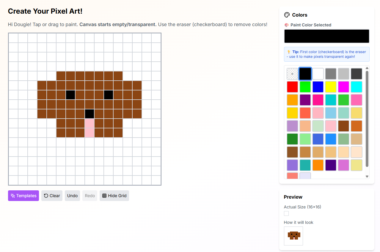 The 16x16 grid matches the Yoto screen size, with colours selected to look good on that display. It's touch-friendly for tablets and mouse-friendly for computers, with auto-save so work doesn't get lost. You can also download icons to use on your own MYO content, and import and export to keep editing. Simple on purpose because it just needs to get the job done.
